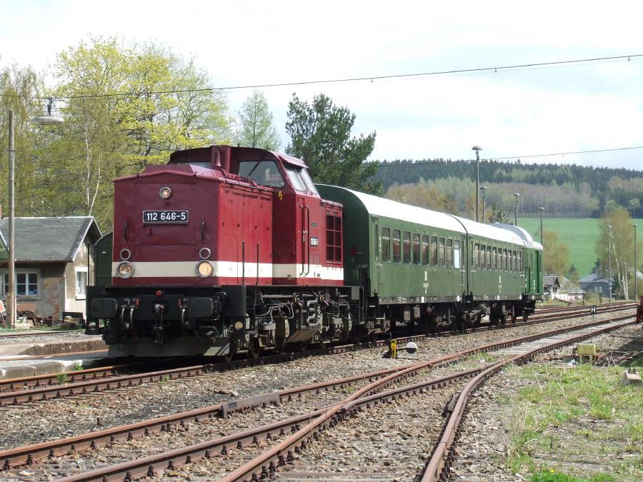 Schlettau. Ausfahrt für 112 646 mit einem Personenzug nach Schwarzenberg.