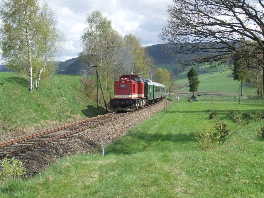 Emmlerweg oberhalb des Markersbacher Viaduktes. 112 326 mit einem Personenzug Schwarzenberg - Schlettau.