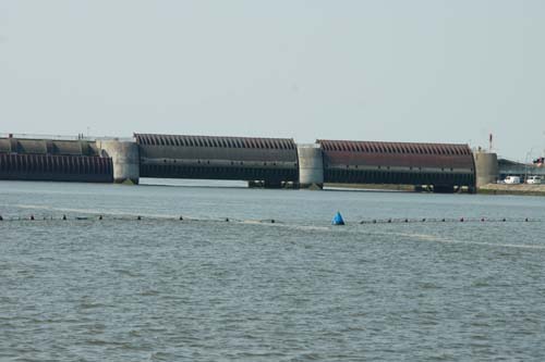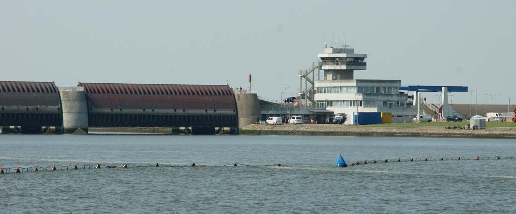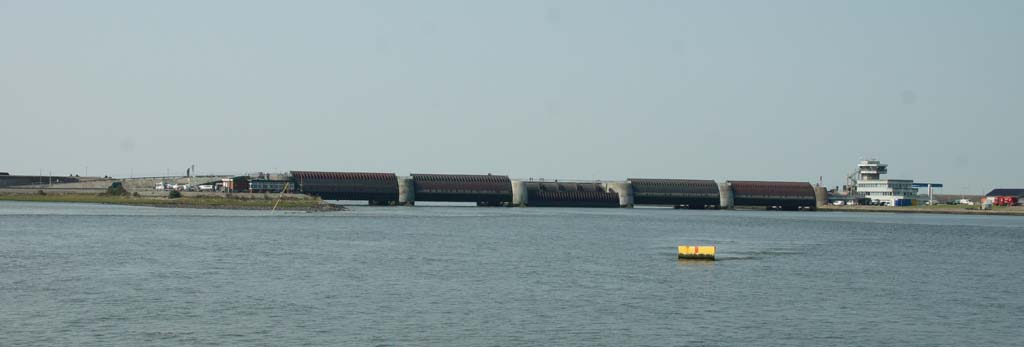 | Die Stauwerke an der Mündung der Flüsse und Flüsschen dienen letztendlich dem selben Zweck wie die bekannte Variante in Groß (das Eidersperrwerk): Regulierung des Wasserstandes der Flüsse durch Anstauen und damit verminderten Abfluss ins Meer einerseits und andereraseits die Verhinderung des Hineindrückens großerWassermengen bei Sturm und Sturmflut... | ||||