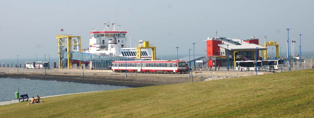 Der Zweibeiner wusste zu berichten, dass in Dagebüll immer ein gut geladener Kamere-Aku von Vorteil sei... O.k. - für den Fähranleger scheint das tatsächlich zu stimmen. Die Fähren der Wyker Dampfschiffreederei bedienen die Fährverbindungen zur Insel Föhr und Amrum. Und der Hafenbahnhof wird von der Privatbahn "NEG" mit dem "Große-weite-Welt-Bahnhof Hiebüll" sogar an das IC-Netz der DBAG angeschlossen. Mein Zweibeiner hat mir als Eisenbahnkundiger versichert, dass der 926-er NEB-Triebwagen auch den einen oder anderen IC-Kurswagen transportieren kann. |