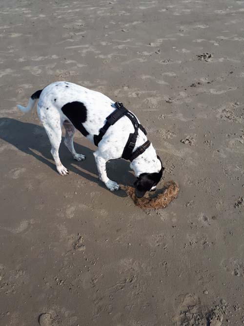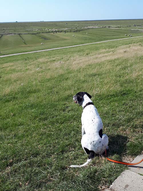 | Es wurde also ein neues Ziel fällig... Letztendlich waren wir auf der Halbinsel Nordstrand. Bisschen Umschauen, mit dem Zweibeiner mal ins Watt, Kaffee für die Zweibeiner und wieder bisschen Umschauen. | ||||