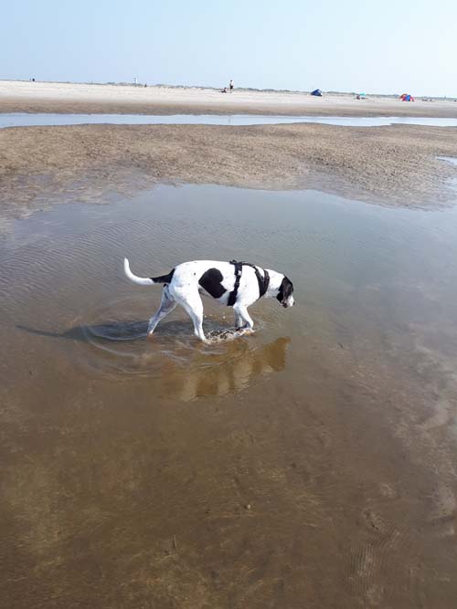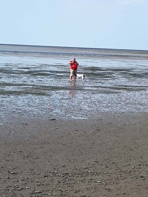 Der Hundestrand von St. Peter Ording ist wirklich der hündische Wahnsinn und für alle Hunde und Zweibeiner hervorragend markiert. So können sich "Nichthundefreunde" nicht darauf berufen, versehentlich an den Hundestrand geraten zu sein. Auf einem breiten Streifen dürfen Hunde von den Dünen bis zum Wasser ohne Leine unterwegs sein. Und es waren viele Hunde mit ihren Zweibeinern unterwegs. Weil gerade Ebbe war, war ich natürlich auch wieder im Watt. Anders als zum Beispiel bei Friedrichskoog ist das Watt bei St. Peter Ording nicht wirklich "trittfest", sondern eher etwas "pampig"... |