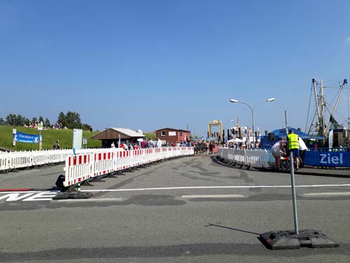 | Genau an diesem Tag fand auf Pellworm zum 20. Mal ein Triathlon statt. Guttrainierte Zweibeiner müssen da zuerst ein Stück im offenen Meer schwimmen, dann 20km Rad fahren und zum Schluss noch 5km rennen... Offenbarwarzu diesem Event jederin Pellworm ansässige Hund am alten Hafen präsent. Und auch viele von Land zugereisten Hunde waren zugegegen. Na ja -die meisten 4-Beiner waren freundlich und gut gelaunt, so dass es nur ganz wenige hündisch-verbale Auseinandersetzungen gab. | ||||