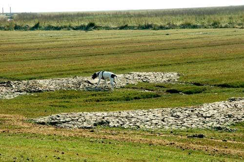 | Aber dann ging es los - wir wollten zur Hamburger Hallig, wo es einen sehr tollen Hundestrand geben sollte. 4km vor dem eigentlichen Strand gibt es am Deich in den Salzwiesen einen Parkplatz und eine Schranke: Entweder 6,00€ für die Benutzung der Mautstraße oder 4km zu Fuß. Leider waren auf dem Weg zur Hamburger Hallig die Überwege über die Siele in den Salzwiesen mit solchen ganzgroben Lichtgitterrosten abgedeckt, wo ich nicht drüber konnte. Solche Lichtgitterroste ganz ohne seitlichen Rand sind für mich einfach ein no go. Alles o.k. - Hochwasserschutz und wohl auch Seuchenschutz für die Schafe - alles schön und gut. Aber muss das gerade so sein? Wenn man an das Geld von den hier urlaubenden Hunden und dessen mitgereiste Zweibeiner geht, ist man ja auch nicht so wählerisch... | ||||
