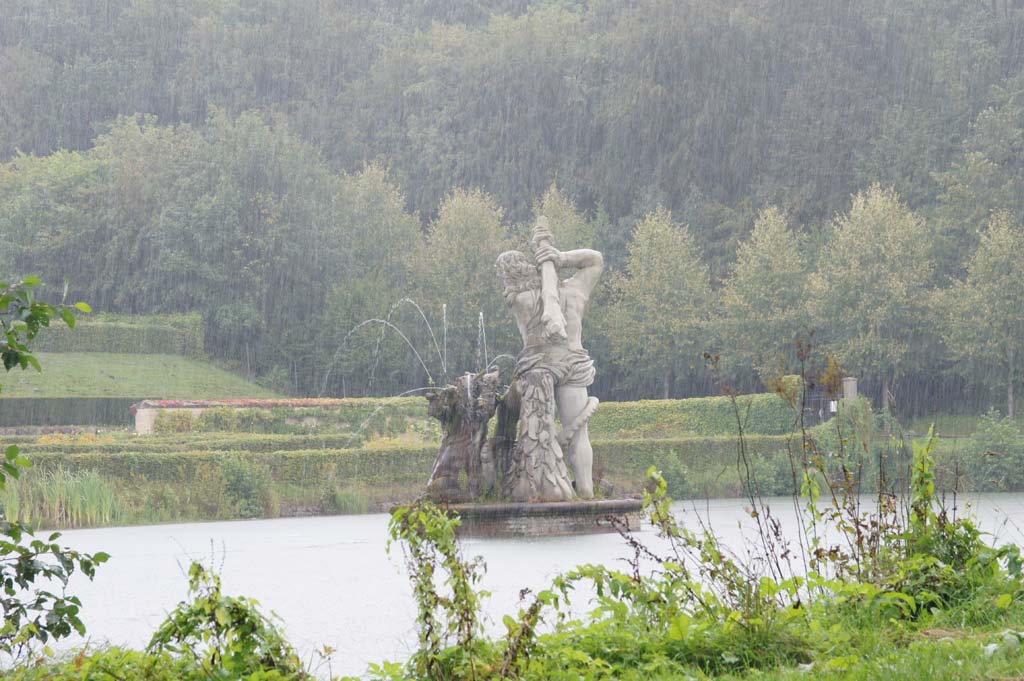 | Wenig später - strömender Regen. (Nein - der Zweibeiner hat das Foto nicht vermurkst - das kommt vom Regen...). Das Foto zeigt den Hercules im unterenTeil des Barockgartens. Der Regen hat dann einen längeren Besuch des Barockgartens verhindert. | ||||
