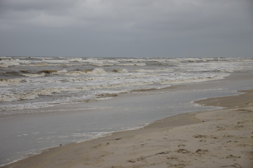 | Bei diesem starken Wellengang trauten sich auch die verwegensten Zweibeiner nicht in das Wasser - zumindest nicht in mehr als Knöcheltiefe. Aber selbst Knöcheltiefe wurde meiner Zweibeinerin zum dramatischen Verhängnis. Eine nicht beachtete, ein klein wenig höhere Welle und wuff waren deren Jeans von den Knien abwärts ein stark tropfendes etwas... | |||||