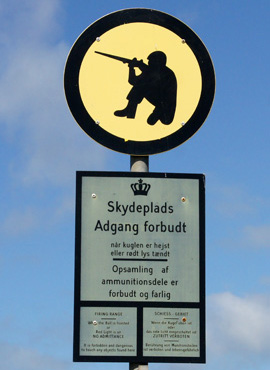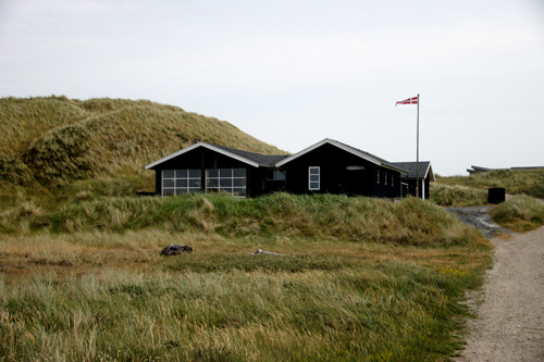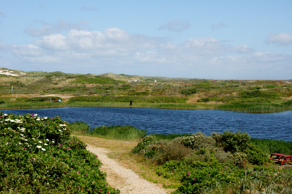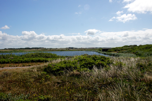 Nicht nur rund um Blahvand und Vejers gibt es weitläufige Übungsplätze für die dänische Armee. Auch am Südende der Nehrung befindet sichein solcher Übungsplatz. Bei den 2 Seen handelt es sich um die sog. Forellenteiche. Angler können hier gegen Zahlung einer Gebühr von 20€ (nicht DKR!) für 3 Stunden angeln. Beim Blick über den nördlichen See schaut man auf die stark befahrene Fernverkehrsstraße 181, die von Esbjerg aus in Richtung Skagarrak verläuft. |