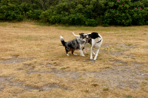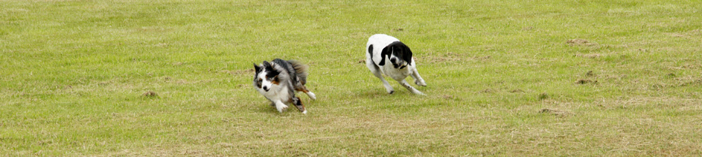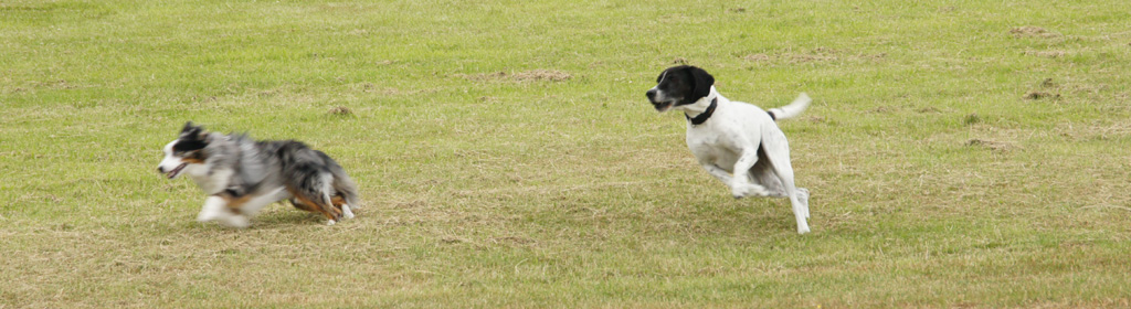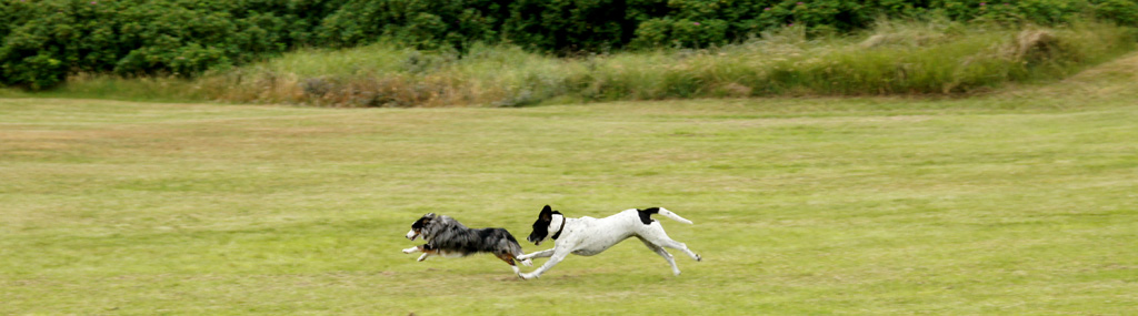 | Die Wiesen rund um unser Ferienhaus konnte man wunderbar dazu benutzen, sich in einer etwas flotteren hündischen Gangart zu bewegen. Ich und Odin haben das mehrfach getan - nicht nur am Ferienhaus, sondern gern auch am Strand... Einige Tage später war es mit der Möglichkeit des Herumtollens am Haus vorbei. Aber dazu vielleicht später... Jetzt geht es erst einmal um die anmutigen Bewegungen 2-er toller Hunde... | |||||