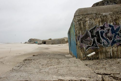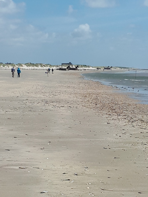 | So ging es auch noch einmal zur Bunkerfestung - quasi zur Informationsweitergabe an Odins Zweibeiner. Trotz Sturm gab es sogar einen kurzen Strandspaziergang. Meine Zweibeiner glaubten, dass das der Strand und die Bunker sind, wo vor vielen Jahren der Film "Die Olsenbande fährt nach Jütland" gedreht worden ist. |