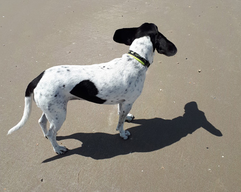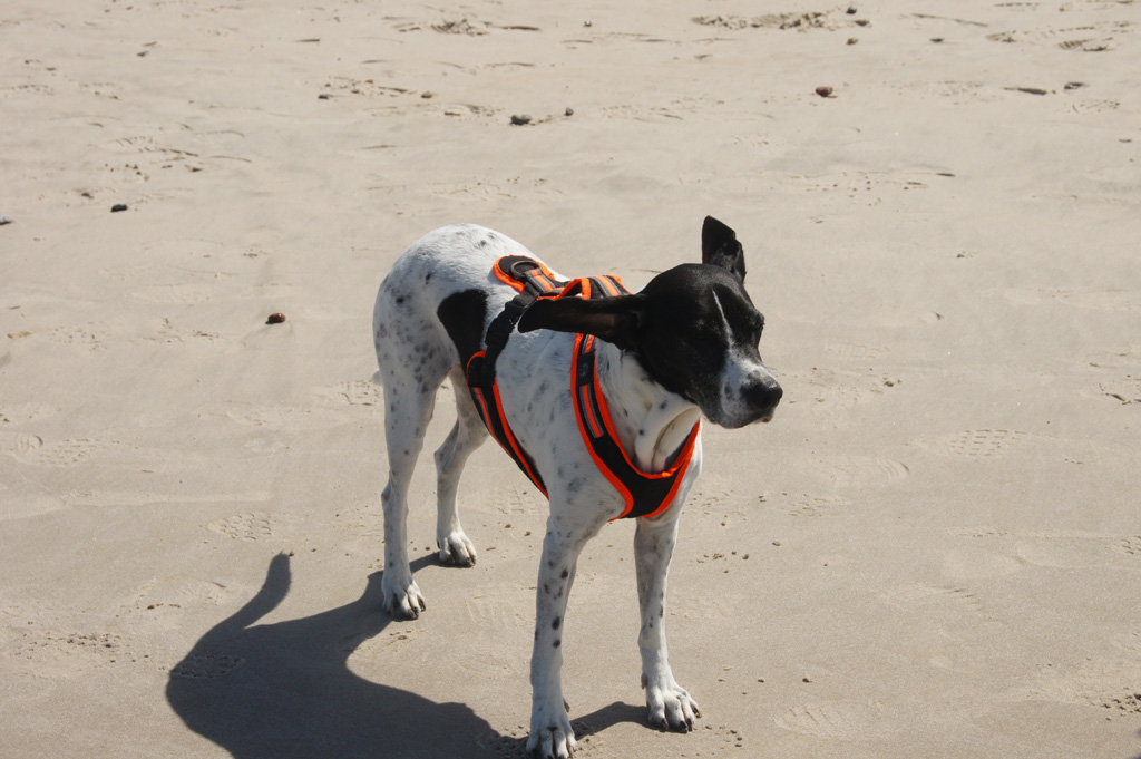 Während die männlichen Zweibeiner das Bunkermuseum besuchten, machten ich und Odin mit den Zweibeinerinnen einen ausgiebigen Strandspaziergang. Dass der Wind an diesem Tag wieder einer der kräftigen Sorte war, zeigen meine fliegenden Ohren (beachte insbesondere den Schattenwurf!). |