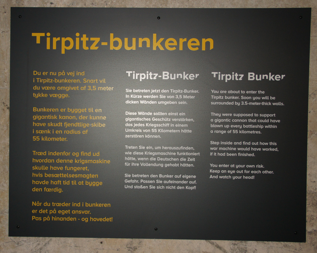 | Odins Zweibeiner hatte großes Interesse am Tirpitz-Bunker-Museum, das meine Zweibeiner bereits am letzten Urlaubstag des Vorjahres - das war der Tag der Eröffnung - besucht hatten. So wurde beschlossen, den beiden männlichen Zweibeinern zeitlich begrenzten Sonderfreilauf zum unbegleiteten Besuch des Museumsbunkers zu gewähren. | |||||