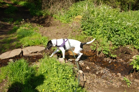 | Aber der Weg wurde noch unwegsamer, wir mussten über Geröll und einmal musste ich mit der Zweibeinerin pausieren, weil der Zweibeiner erstmal einen begehbaren Weiterweg erkunden musste. Als der gefunden war, führte die Weg über eine moorige Wiese (iex!!!) und eine Tierkoppel. Endlich war da dann ein fester Weg zurück nach Arlid... | |||