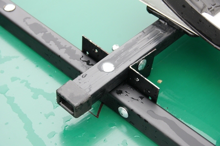 | Auf den Deckel wurde ein H-förmiger, von einem netten Kollegen geschweißter Rahmen aus schwarzem Vierkantrohr 30x30x2 als Grundträger für die Fahrradträger aufgeschraubt (schwarzes Rohr deshalb, weil mit dem üblichen Hobbywerkzeug deutlich einfacher zu bearbeiten als V2a). | |||