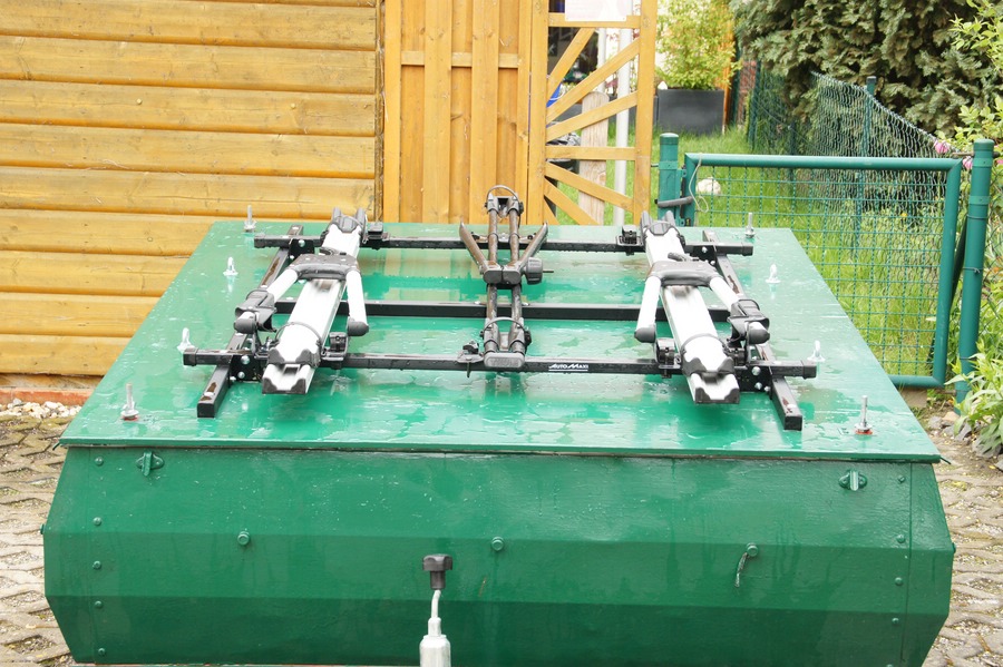 | Die planerische Lösung für den gleichzeitigen Transport von 2 Tourenrädern und einem Dogscooter oder alternativ einem 28-er Tourenrad mit Kastenrahmen und einem Fahrraddreirad oder Hundetrike sah die Ausrüstung des Anhängers mit einem Deckel vor, auf dem die entsprechenden Träger (Fahrradträger für den Dachtransport) für Fahrräder und Trike / Fahrrad-Dreirad montiert werden. | |||
