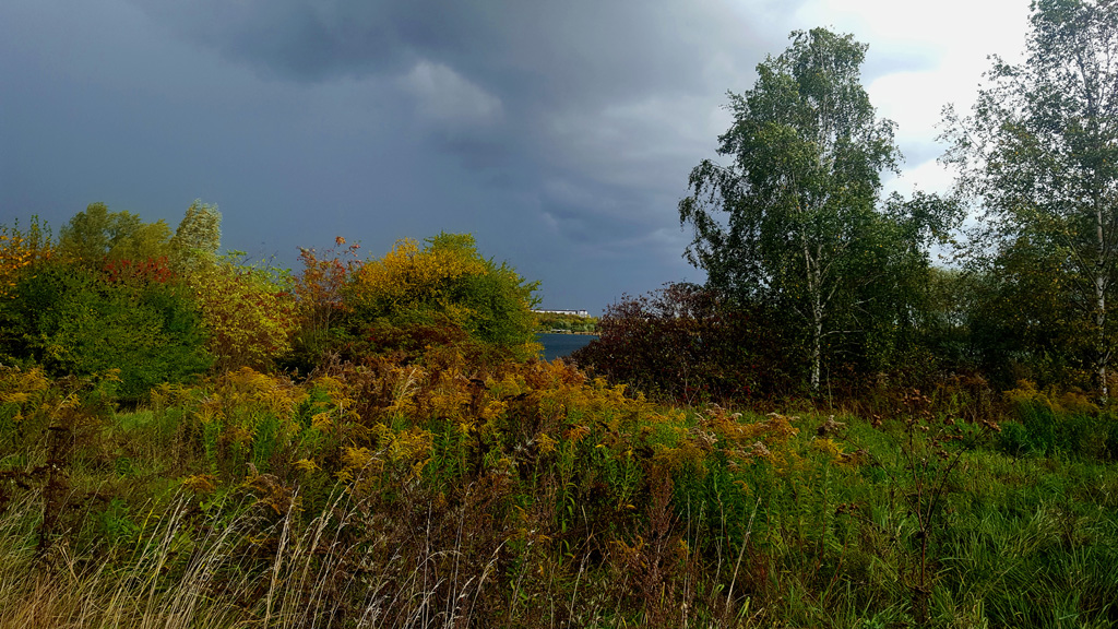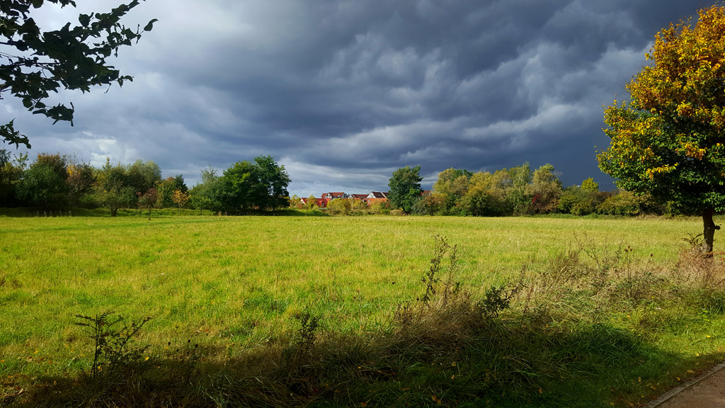 | Dann wurde es mit einem Mal ziemlich dunkel - Zeit, um sich auf den Weg nach Hause zu machen... Zumal es sich - wie meine Hundeohren festzustellen wussten - es sich um ein Gewitter handelte. Und bei starkem Gewitter wird meine Anwesenheit bei der Zweibeinerin im festerlosen Bad benötigt... | ||||||