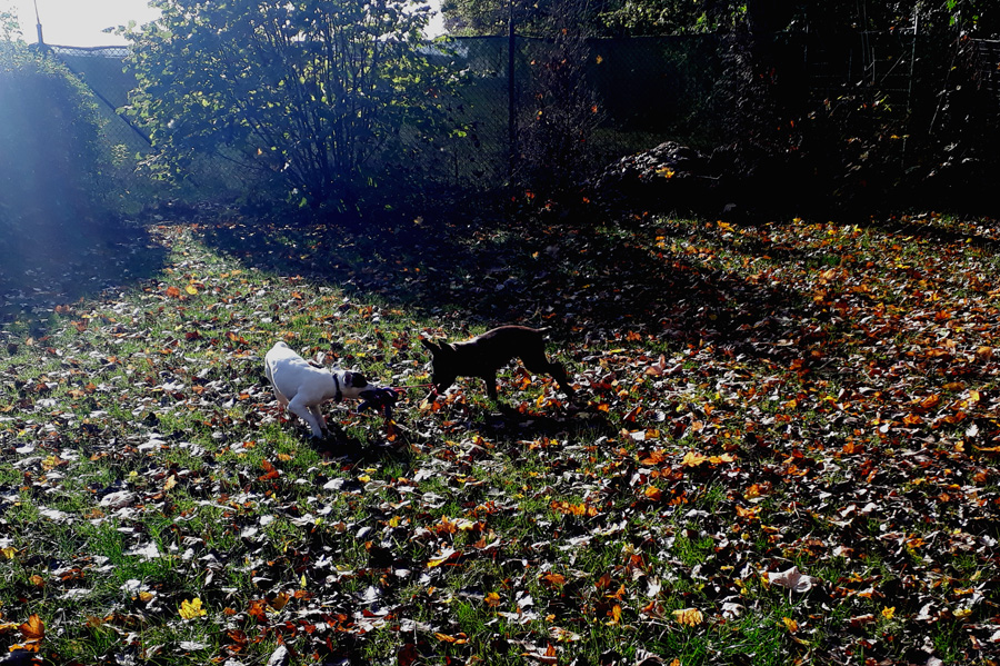| Dann gab es noch einen gemeinsamen Waldspaziergang mit dem Russle und dem kleinen Marek. Der hat bei Robert schon eine Menge gelernt. Der Russle war zwischendurch bissel genervt, einfach weil ich schneller war und ihm gezeigt habe, wo Pointer ihren Most holen. Wäre ja noch schöner, wenn ich vor so einem Terrier einknicken würde, bloß weil der paar Jahre jünger ist. | ||||||