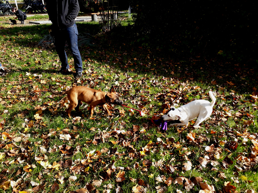 | 22.10.2017 | Heute war ich zusammen mit meinem Zweibeiner mal wieder mit meinem Trainer Robert unterwegs... Und Robert hat einen neuen Hund - den Mali-Welpen Marek. Marek ist erst 11 Wochen - das hat mich schon interessiert. Schließlich weiß der Robert, dass ich mit Welpen richtig gut kann. Da kehre ich die "Tante Frieda" raus. Und dann war noch der Russle dabei, der schon seit Monaten unseren kleine elitären Trainingskreis immer mal aufmischen muss. | |||||