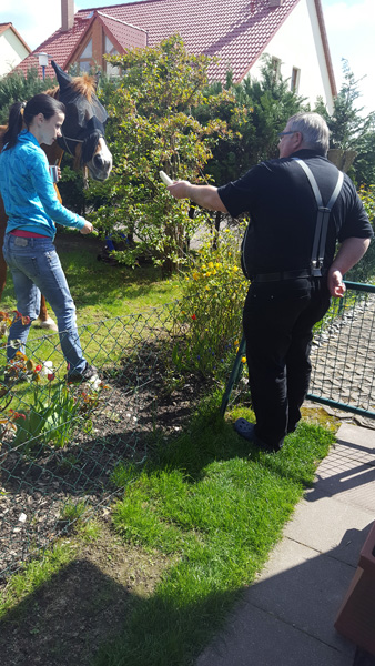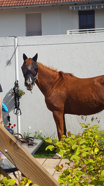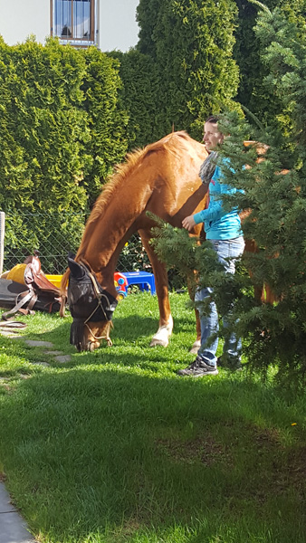 | Am Freitag war das Wetter gar nicht schlecht und plötzlich war da nachmittags etwas großes Braunes im Garten vom Nachbarn. Mein erster Gedanke ging in Richtung "Osterhase"- bis mir meine Zweibeiner erklärt haben, dass ein Osterhase ein klein wenig anders sei. O.k. - nun weiß ich, dass das das Pferd der Nachbarstochter war... | ||||||