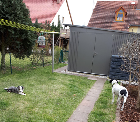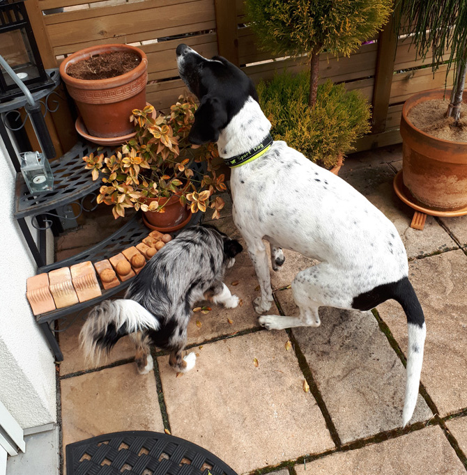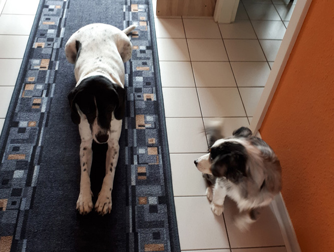 | 28.04.2018 | Gestern habe ich wieder Besuch bekommen - Odin. Anlass war die Jugendweihefeier des Neffen der Zweibeinerin. Ein bisschen ruhiger ist der kleine Zwerg schon geworden - er geht mir nicht mehr so permanentauf die Ketten. Meine Zweibeiner und Odins Zweibeiner haben sogar mal ganz vorsichtig überlegt, ob Odin nicht schon mit mir und meinen Zweibeinern mit nach Dänemark fahren soll. Na mal sehen, was da draus wird... | |||