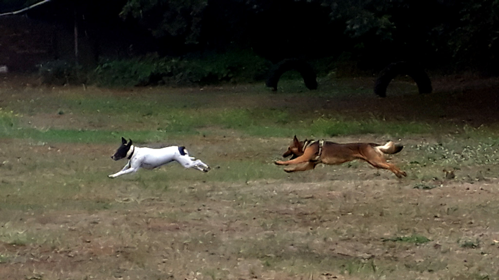 | Heute haben wir uns dann wieder getroffen. Eigentlich ist das Spielen in der Hundeschule gar nicht so mein Ding - wahrscheinlich bin ich einfach aus dem Alter raus. Aber heute habe ich - ganz zum Erstaunen der anwesenden Zweibeiner - mit Arco richtig die Sau rausgelassen. | ||||