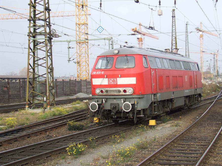 25.10.2008. Die beiden planmäßigen "Rangierdreibeine" (V60-DB) sind wegen der "Umsetzerei" völlig überfordert. Zur Hilfe kam die Fernverkehrs-Schlepplok 218 831.