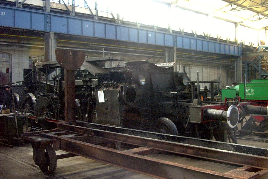 16.02.2002. Fahrwerk der 55 19 nach dem Abheben des Altkessels in der Richthalle.