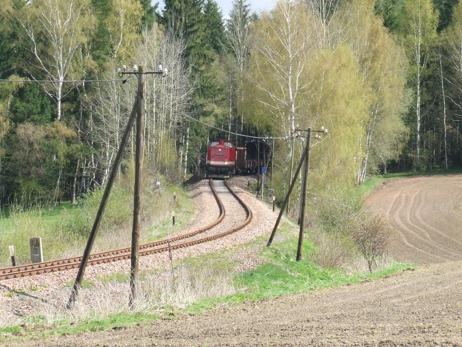 Der Güterzug ist auf dem Weg zurück nach Markersbach. Am BÜ Emmlerweg zwischen Scheibenberg und Markersbach entstanden die nächsten Fotos... Zuglok ist 112 326.