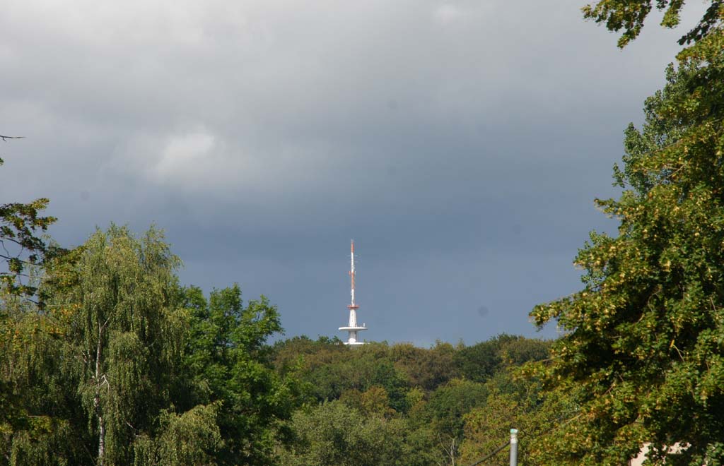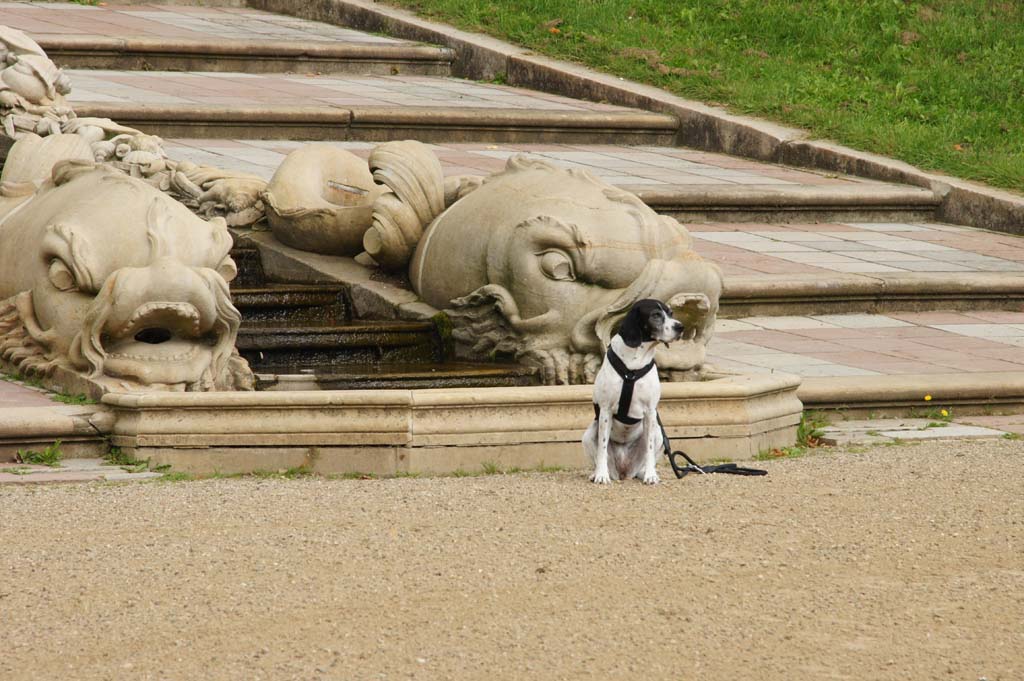 | Wenig später - strömender Regen. (Nein - der Zweibeiner hat das Foto nicht vermurkst - das kommt vom Regen...). Das Foto zeigt den Hercules im unterenTeil des Barockgartens. Der Regen hat dann einen längeren Besuch des Barockgartens verhindert. | ||||