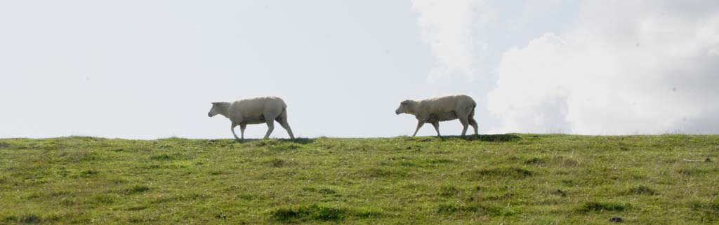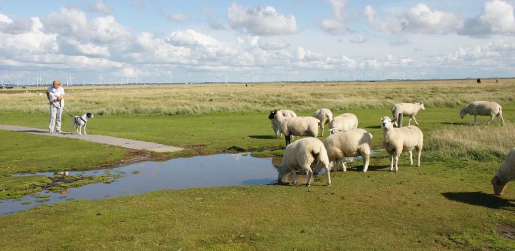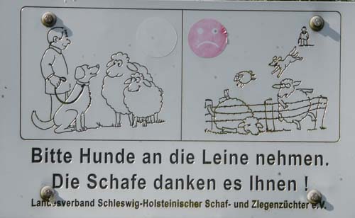 Das nebenstehende Schild am Dockkoog-Parkplatz kann ich so gar nicht nachvollziehen... Wieso "Hunde an die Leine"? - schließlich führen doch die Hunde die Zweibeiner. "Einwirkungen" auf die Schafe gibt es doch höchstens bei den "Hütern", die sich hin und wieder anbieten werden, den Schafen zu vermitteln, wie Schaf im Gleichschritt maschiert oder einen Kompanieweisen schnellen Stellungswechsel durchführt. Und überhaupt erzeugen doch insbesondere die Zweibeiner-Welpen einen solchen Lärm, dass Schaf Angst und Bange werden muss. Wieso verdächigt man dann uns Hunde? Ich selber wünschen allen Schafen hier, dass die politischen Zweibeiner hier in der schafsreichen Gegend dafür sorgen, dass meine Vorfahren (Wölfe) hier nicht sesshaft werden! |