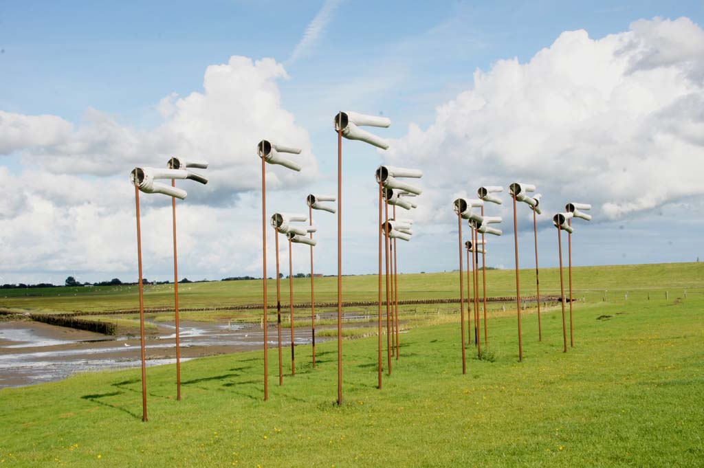Ach ja - das Hotel ist leider ausgebrannt und ein großes Transparent auf der Gebäuderückseite setzt alle Besucher in Kenntnis, dass sich die Versicherung offenbar mit der Regulierung des Schadens sehr schwer tut. Am Dockkoog-Strand gibt es etwas, was manche Zweibeiner als Kunst empfinden. O.k. - das hier ist schon auch aus Hundesicht ganz witzig: "Hosen im Wind." |