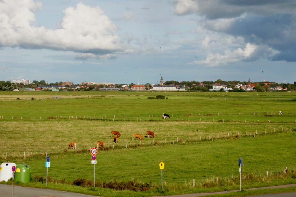 Die Detaillaufnahme zeigt, dass es sich tatsächlich um Zweibeinerhosen handelt... Vom Deich am Dockkoog-Parkplatz hat Hund einen eindrucksvollen Blick auf Husum und dessen Hafen. |