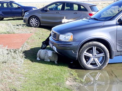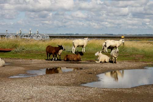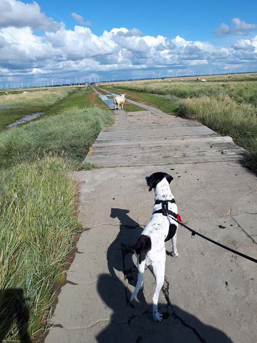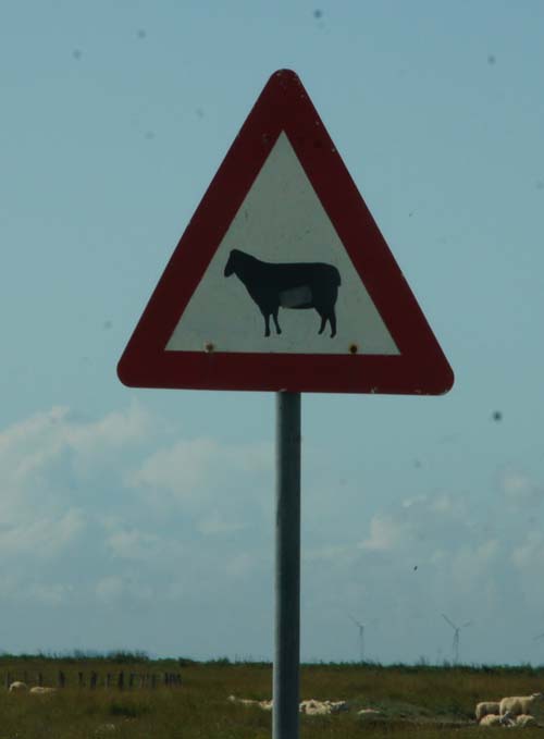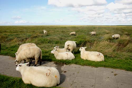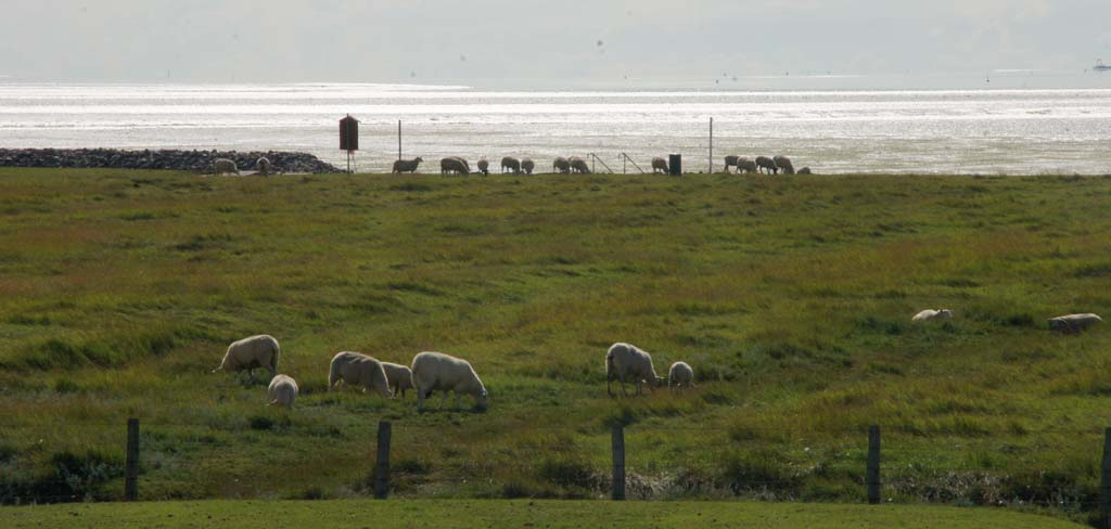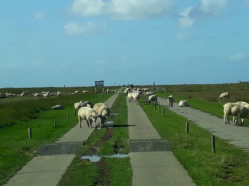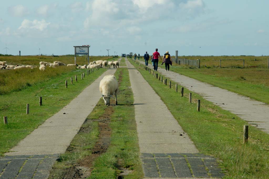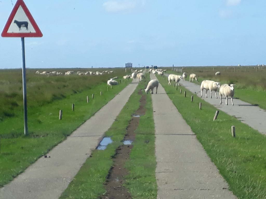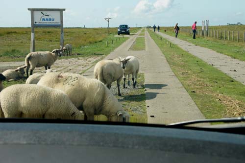 Der Fahrweg zur Hamburger Hallig ist einbefestigter, einspuriger Feldweg mit einigen "Ausweichstellen". Ostdeutsche Zweibeiner hätten dafür den Begriff "KAP-Straße" auf der Zunge. Was besonders ist: Schafe haben absolute "Vorfahrt". Wenn mal so ein Schaf überhaupt nicht bereit ist, "freie Fahrt für freihe Hunde" sicherzustellen, hilft nur, dass ein Zweibeiner aussteigt und das Schaf beseite schiebt... |