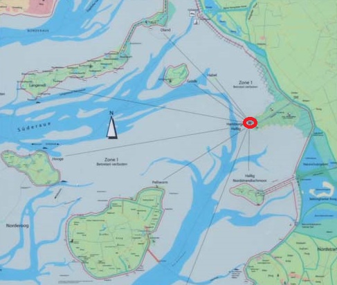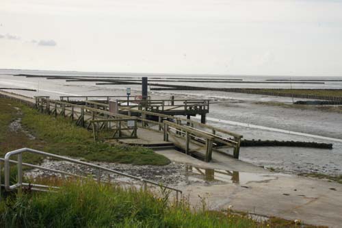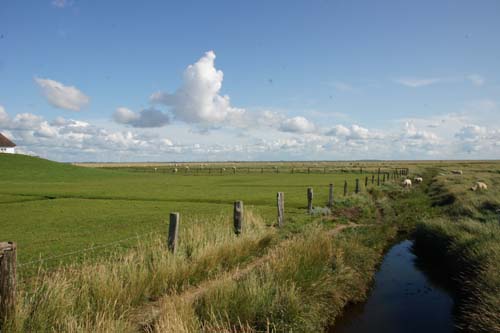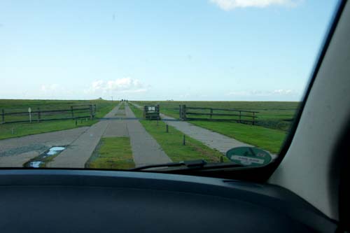| Zur Hamburger Hallig kommt man über einen ca. 4km langen mautpflichtigen Fahrweg. | ||||