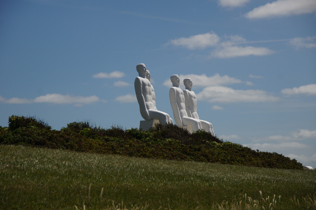 | Eben am Esbjerger Strand befindet sich ein sehr eigenwilliges Denkmal - es heißt, dass das das Wahrzeichen von Esbjerg sein soll... . Na ja - Hund muss ja nicht jede zweibeinerische Idee gut finden. Mir wurde berichtet, dass das Denkmal selbst aus 10km Entfernung vom Wasser her gut sichtbar sein soll. Den Zweibeiner haben die 4 gigantischen Figuren irgendwie an die Monumentalwerke einer dunklen deutschen Epoche erinnert... | |||||