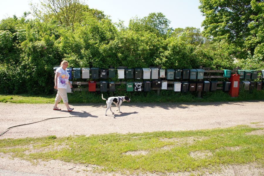 | Auf besondere Art wird in den ländlichen Gebieten in Schweden die Postzustellung gehandhabt. Die Hausbriefkästen befinden sich hier nicht direkt am Haus bzw. auf dem jeweiligen Grundstück. An ausgewählten zentralen Stellen, die vom Zusteller gut zu erreichen sind, sind die Hausbriefkästen mehrerer Häuser zusammengefasst. Die Fahrzeuge der Zusteller sind Rechtslenker, so dass vom Fahrersitz aus die Briefkästen bestückt werden können...: | |||