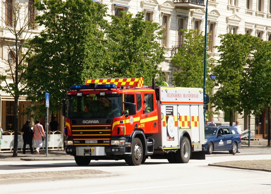 Rüstlöschfahrzeug der Berufsfeuerwehr Helsingborg auf Alarmfahrt.