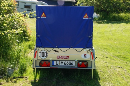 Heck unseres Anhängers. Der Aufkleber unten rechts weist mich als
