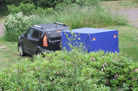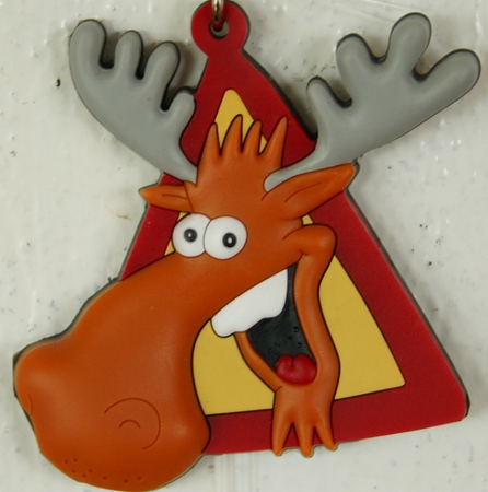| Da ich mich nun richtig gut mit den Elchen auskenne, habe ich meinen Zweibeiner angewiesen, das auch öffentlich zu machen. Seitdem sind an unserem Anhänger nun zwei der wohl bekanntesten schwedischen Verkehrsschilder dran: "Vorsicht - Elche!" | |||