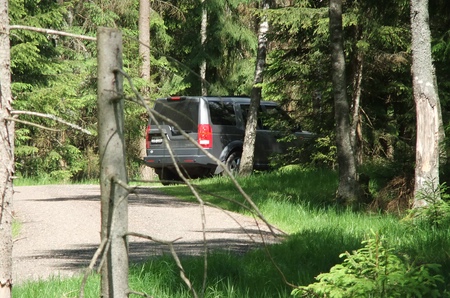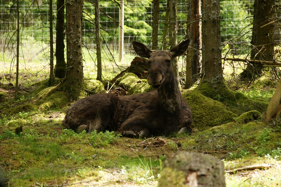 | Die Elche leben auf einem 15ha großen Gelände und durch dieses Waldstück zieht sich ein 3km langer Waldweg. Von diesem Weg aus kann man die Elche von einem Minibus aus oder aus dem eigenen Auto beobachten. Hunde dürfen mit dem Minibus nicht mit, also bin ich mit meinen Zweibeinern mit dem Auto gefahren und wenn wir einen Elch gesehen haben, haben wir angehalten (man darf aber nicht aussteigen) und die Zweibeiner haben fotografiert. | |||