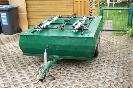 | Die planerische Lösung für den gleichzeitigen Transport von 2 Tourenrädern und einem Dogscooter oder alternativ einem 28-er Tourenrad mit Kastenrahmen und einem Fahrraddreirad oder Hundetrike sah die Ausrüstung des Anhängers mit einem Deckel vor, auf dem die entsprechenden Träger (Fahrradträger für den Dachtransport) für Fahrräder und Trike / Fahrrad-Dreirad montiert werden. | |||