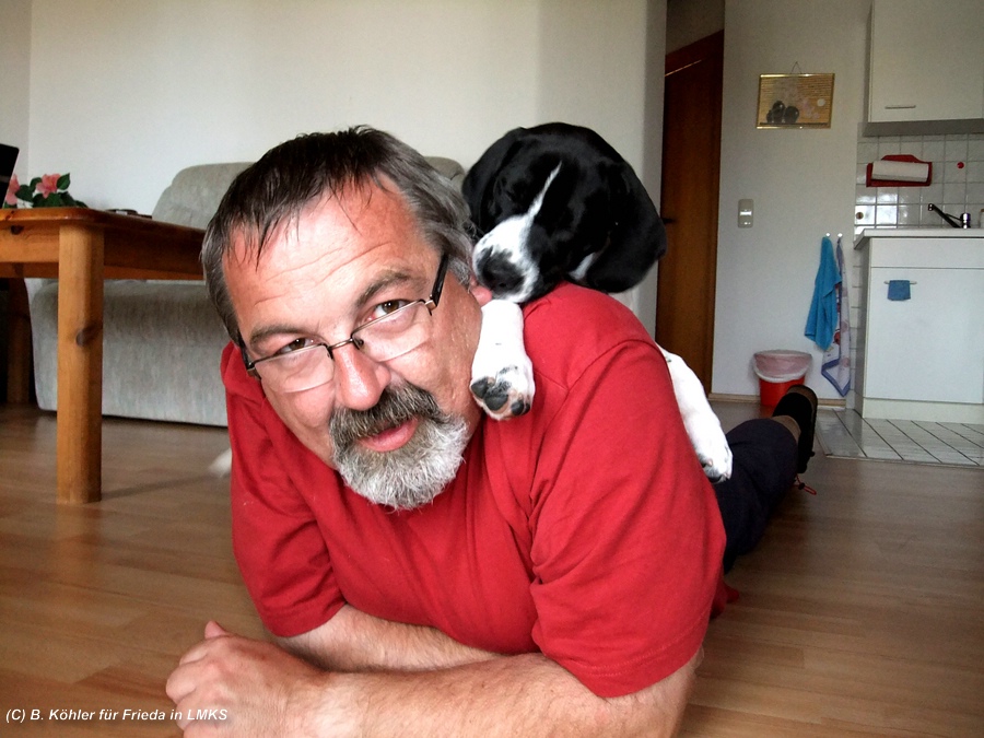 Balgen mit meinem Zweibeiner - er braucht sich nur auf den Fußboden zu legen, damit ich auf seinen Rücken kann...