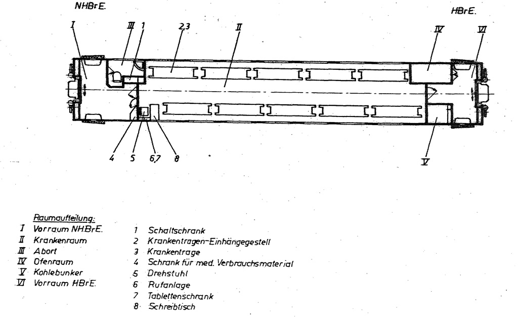 Und auch "auf der anderen Seite der Mauer" hatte auch die Deutsche Bundesbahn für die Bundeswehr einen vergleichbaren Zug und weitere für den Zweck entsprechend vorgerüstet Wagen im Bestand - dort als "Krankentransportkompanie (Schiene)" bezeichnet. Auch darüber wird „etwas weiter hinten“ zu berichten sein. Die bei der DB verwendete Bezeichnung "Krankentransportzug" trifft die Aufgabenbeschreibung auf den Punkt. | |||
