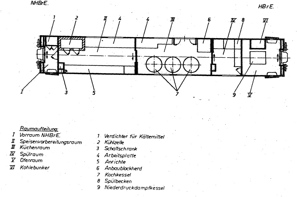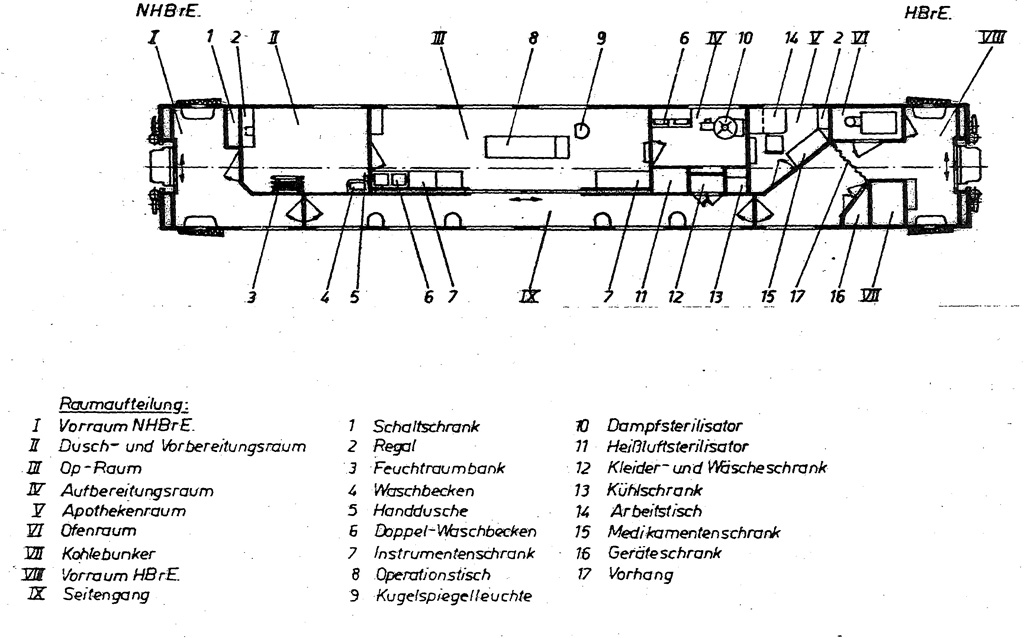 Bghw abgeleiteten Halbgepäckwagen BDghws für die Maschinenwagen. Nach Einsatz der ersten Neubaufahrzeuge war lt. DV971 durch die HA I im MfV (frühere Bezeichnung "Büro des Ministers") folgende Reihung (hier am Beispiel einer aus Neubaufahrzeugen gebildeten Garnitur) angewiesen: 1. Maschinenwagen (NHBrE zu Zugspitze, d.h. Maschinenraum in Richtung Küchenwagen) 2. Küchenwagen (Kesselraum in Richtung MaW) 3. Krankenwagen / Bettenwagen (NHBrE in Richtung KüW / Heizraum in Richtung OP-Wagen) 4. OP-Wagen (HBrE und Heizraum in Richtung Bettenwagen 1) 5. Krankenwagen / Bettenwagen (HBrE und Heizraum in Richtung Zugschluss) |