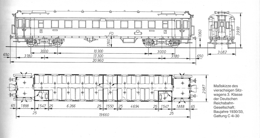des WK2 war der DRG-Eilzugwagen der Bauart C4i. Beachte: Um Verwechslungen zwischen dem Eilzugwagen C4üp und dem Schnellzugwagen C4ü auszuschließen, verwende ich zur Bezeichnung der K-Zug-Altbau-Fahrzeuge grundsätzlich die ursprüngliche Bezeichnung C4i. Die Eilzugwagen der Deutschen Reichsbahn entstanden im Rahmen des Ersatzes der beschleunigten Personenzügen durch Eilzügen mit einheitlichen 4-achsigen Wagen in den 1930-er Jahren. Die Einstiege waren wie bei der Schnellzugbauart C4ü-28 zurückgesetzt und in der 3. Klasse als prägendes Bild der DRG-Einzugwagen an den Wagenenden mit Doppeltüren ausgeführt. 1930 wurde mit der Serienfertigung von Eilzugwagen begonnen. Die erste Generation der Eilzugwagen umfasste die Wagen in genieteter Bauweise der Baujahren 1929–1934 (Bauart C4i-30). LüP 21700mm und 13300mm Drehzapfenabstand. Die Wagen besaßen Drehgestelle der Bauart Görlitz III leicht mit einer zulässigen Höchstgeschwindigkeit von 120km/h Alle Wagen verfügten über Großräume mit Mittelgang, 2+3-Sitzanordnung in der dritten Klasse. Die Wagenübergänge waren als offene Übergangsbrücken ausgeführt und nur mit Scherengittern gesichert; sie durften nur vom Zugpersonal, nicht aber von den Reisenden genutzt werden. Es wurden 1236 C4i-30 gebaut. |