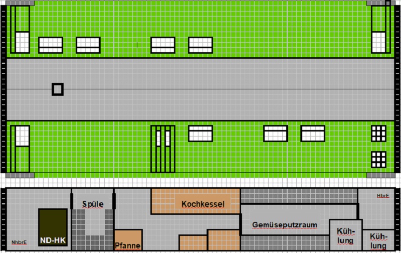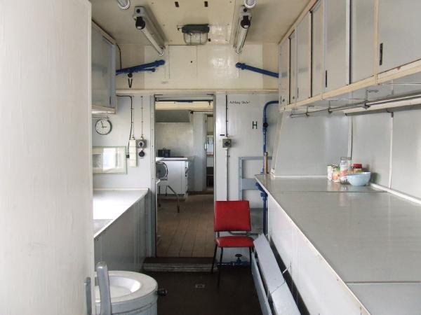 Altbau-Küchenwagen gliederte sich in folgende Bereiche: * Heizraum mit 2 Niederdruckdampfkessel * Kochraum mit 4 dampfbeheizte Kochkessel >>> 2x 300 Liter / 2x 150Liter, 1 Küchenherd (zur Bereitung von Diätgerichten), 2 Destillationsgeräte mit Holzkohlefeuerung zur Trinkwasseraufbereitung, 2 aluminiumbeschlagende Arbeitstische * Abwaschküche * Zuputzraum mit Arbeitstischen, Kartoffelschälmaschine, Küchenmaschine * Abstellraum (für hochwertige Lebensmittel) mit Großkühlschrank Im Dachbereich des Kochraumes befanden sich 2 große Wasserbehälter mit einem Volumen von insgesamt ca. 3 Kubikmetern. Die Kapazität der Küche lag bei 900 Eintopfportionen bzw. 300 Poritionen bei Zweitopfgerichten pro Mahlzeit zuzüglich von 50 Diätessen. |