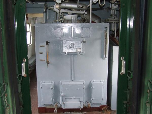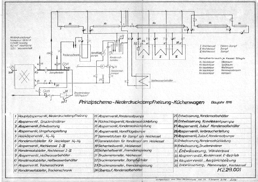 Der Küchenbereich hat folgende Dampfverbräuche: 300-Liter-Dampfkochkessel und 300-Liter-Elektro-Dampf-Kochkessel je 95 kg/h und die Heizkörper im Küchenwagen, Heizschlangen zur Wassererwärmung und Trockenschrank in Summe 30 kg/h Das anfallende Kondensat wird gesammelt und dem Heizkreis wieder zugeführt. Der maximale Betriebsdruck des Dampfsystems liegt bei 0,5 bar (Überdruck), die Kochkessel dürfen mit maximal 0,4 bar Überdruck betrieben werden. Eine automatisch wirkende Schutzeinrichtung, die bei zu niedrigem Wasserstand im Dampferzeuger diesen automatisch außer Betrieb setzt, ist nicht vorgesehen. Als 2. Speiseeinrichtung steht neben der eigentlichen elektrischen Kesselspeisepumpe eine manuelle Handflügelpumpe zur Verfügung. Für die Bedienung der Dampferzeugeranlage muss der Kesselwärter mindestens im Besitz einer Berechtigung als Niederdruckheizer sein – der Kesselwärter eines K-Zuges wurde von einem naheliegenden Bahnbetriebswerk (also von der HVM) gestellt und hatte dann natürlich eine Ausbildung zum Dampflokheizer oder war geprüfter Tf für Dampflokomotiven. |