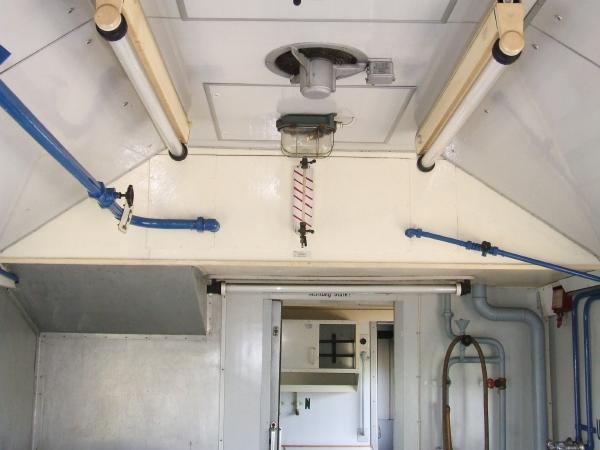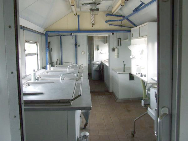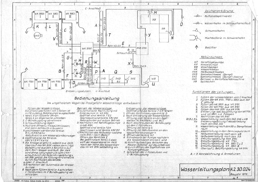 eine aufwändige Wasseranlage: Die Trinkwasseranlage besteht aus insgesamt 8 Wasserbehältern mit einem Gesamtfassungsvermögen von 5000 Litern. Im Kochraum befinden sich im Dachbereich 2 Behälter: ein 515 Liter fassender Kaltwasserbehälter und ein ebenso großer Heißwasserbehälter (Beide Behälter im Dachbereich). Beide Behälter sind drucklose Vorratsbehälter und dienen als Zulauf zu den Zapfstellen im Küchenwagen. Der Ausfluss des Wassers aus den Zapfeinrichtungen wird ausschließlich durch das natürliche Gefälle erreicht. Im Gemüseputzraum befinden sich insgesamt 6 Kaltwasservorratsbehälter, aufgebaut als Wasserkästen auf dem Wagenboden und rechts (mit 3 x 775 Liter rechts in Blickrichtung HBrE) und links (mit 3 x 580 Liter Wasserinhalt links in Blickrichtung HBrE) an der Seitenwand angeordnet.Der Wasserstand dieser 6 Behälter wird über Verbindungsleitungen permanent ausgeglichen. Aus den Behältern im Gemüseputzraum wird mittels einer E-Pumpe der im Dachbereich des Spülraumes befindliche Kaltwasserbehälter mit 515 Litern Wasserinhalt gespeist. Für den Fall der Nichtverfügbarkeit der E-Pumpe steht eine Handpumpe zur Verfügung. Von diesem gibt es ein elektrisches Überströmventil zu ebenfalls im Dachbereich des Spülraumes angebrachten und mit einer dampfdurchströmten Heizschlange versehenen Heißwasserbehälter, wobei sich bei geöffneten Ventil ein Wasserstandsausgleich zwischen diesen beiden Wasserbehältern im Spülraum einstellt. Bei Frostgefahr und abgestellter Heizung im Küchenwagen muss das gesamte Wasservorrats- und Verteilungssystem entleert werden. |