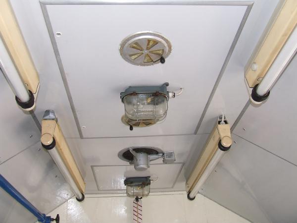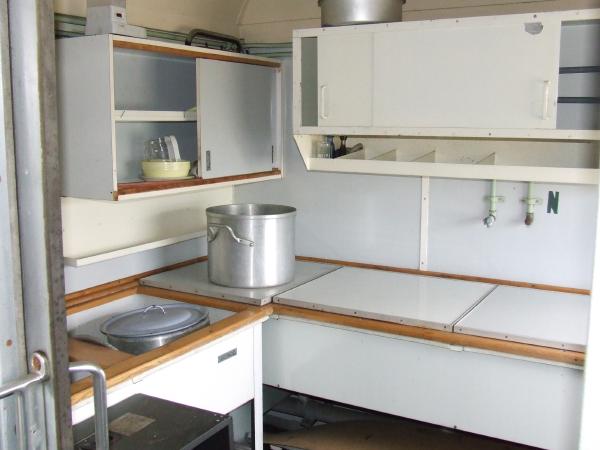 Kochraum befindet sich folgende Ausstattung: 2 dampfbetriebene Speisekochkessel 300 Liter Typ 1040 1 dampf- oder elektrisch betriebener Speisekochkessel 300 Liter Typ 1360 1 elektrischer Blockherd mit 6 Kochplatten Geschränk zur Unterbringung von Geschirr und Küchengeräten. Der Kochraum wird durch elektrisch angetriebene Dachlüfter belüftet. |