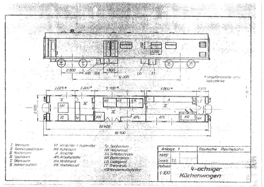 Die Ablösung der Altbau-Küchenwagen erfolgte zeitgleich mit den Maschinenwagen. Deshalb gilt hier sinngemäß all das, was schon zu den Maschinenwagen (Neubau) ausgeführt wurde. Allerdings ist der Aufwand, der bei der Ertüchtigung der serienmäßigen Bghw-/BDghws-Wagenkästen erforderliche Aufwand erheblich größer. Zeitgleich mit dem zugehörigen Maschinenwagen wurde der erste Neubau-Küchenwagen am 07.12.1974 für den Seddiner K-2 als Nullserienfahrzeug in Dienst gestellt. Die Auslieferung und Indienststellung der anderen Küchenwagen erfolgte im Jahr 1976 jeweils gemeinsam mit dem zugehörigen Maschinenwagen, zunächst als Ersatz für die Altbauwagen der K-1 bis K-10 und anschließend für die neu in Dienst zu stellenden K11 bis K-14. | |||