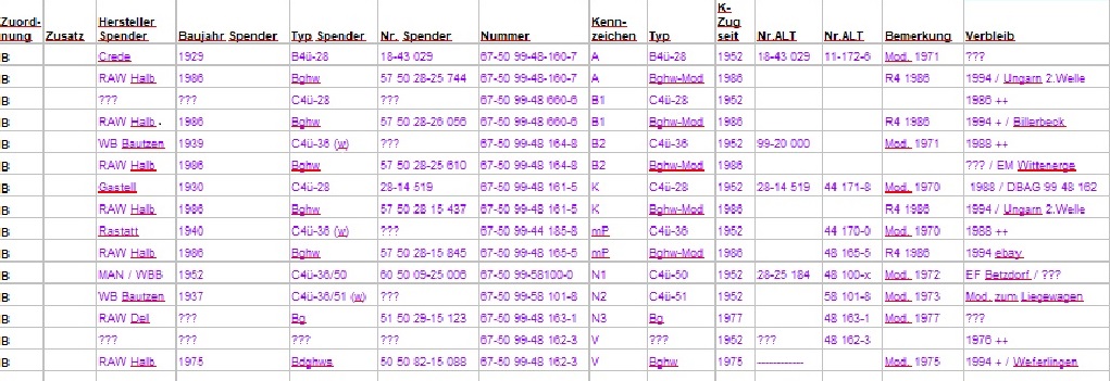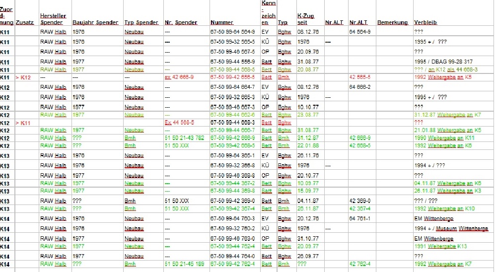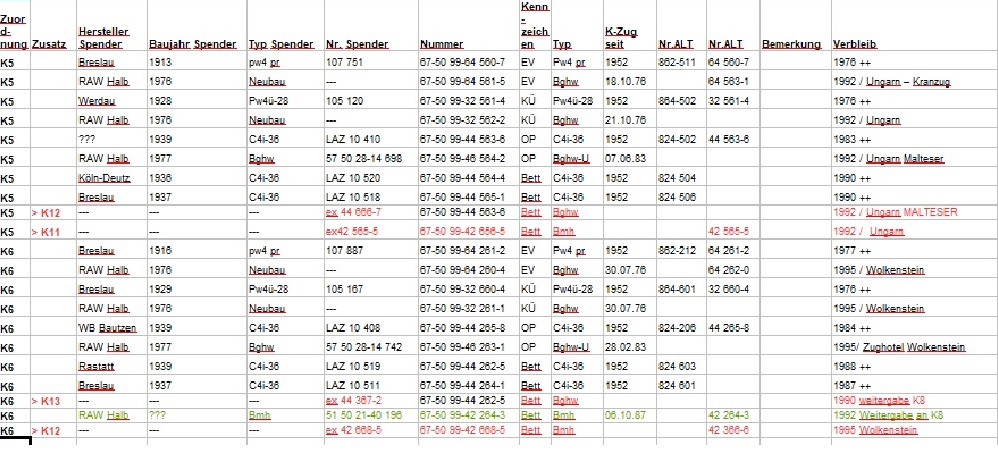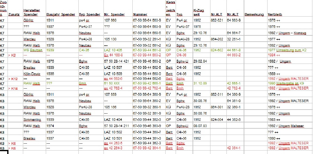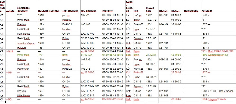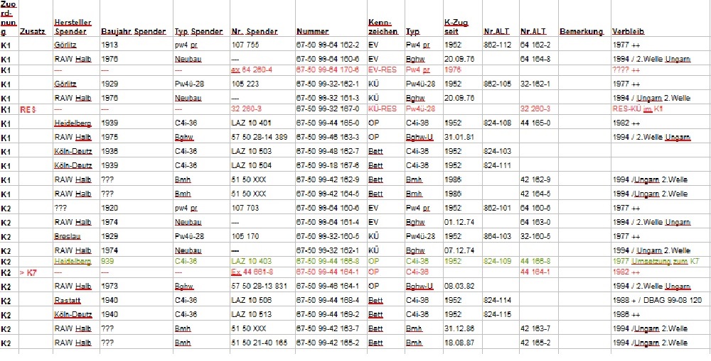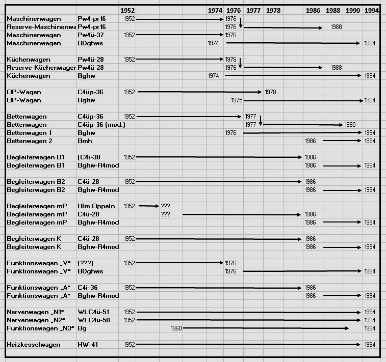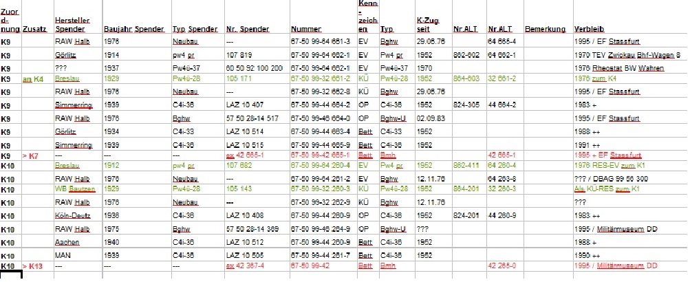 Übersicht zum Einsatz der K-Zug- und Sonderwagen |